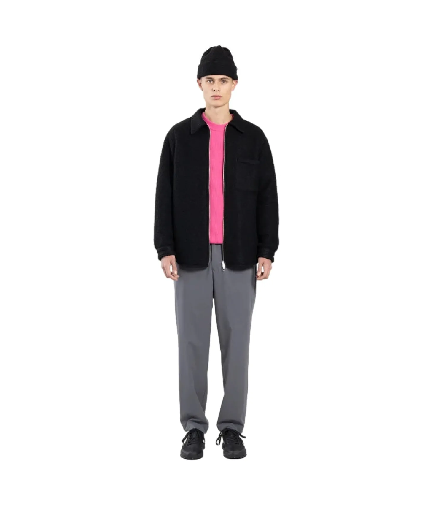 Laget av 78 % polyester, 18 % viskose, 4 % elastan
