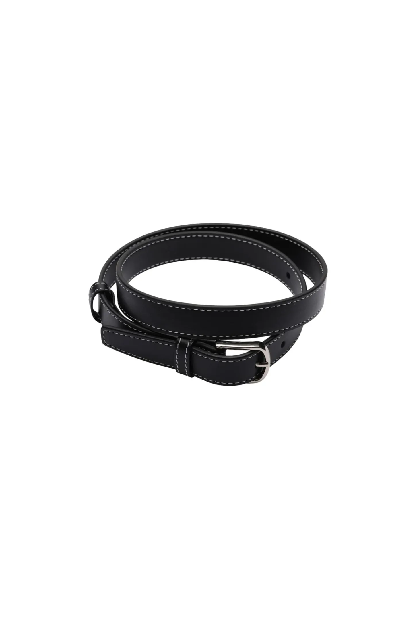 Embla-belte i svart, detaljert med kontrasterende hvite sømmer. Laget av slitesterkt PU-skinn, utstråler dette allsidige tilbehøret tidløs stil og holdbarhet. Enten det er festet rundt livet for å definere silhuetten din eller avslappet drapert over favorittjeansene dine.