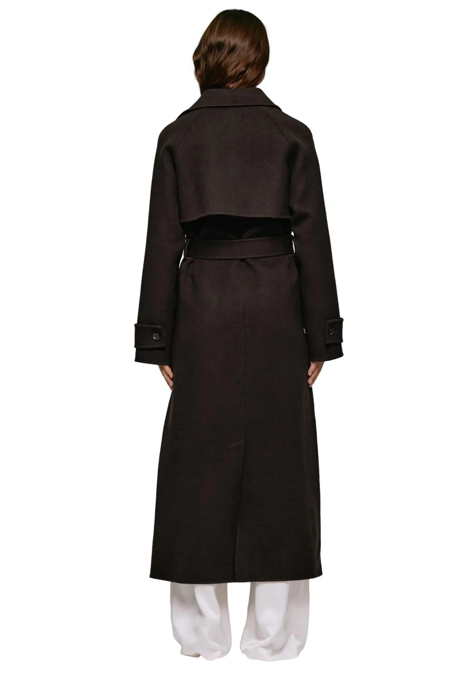 Lang dobbelspent trenchcoat med belte i midjen.