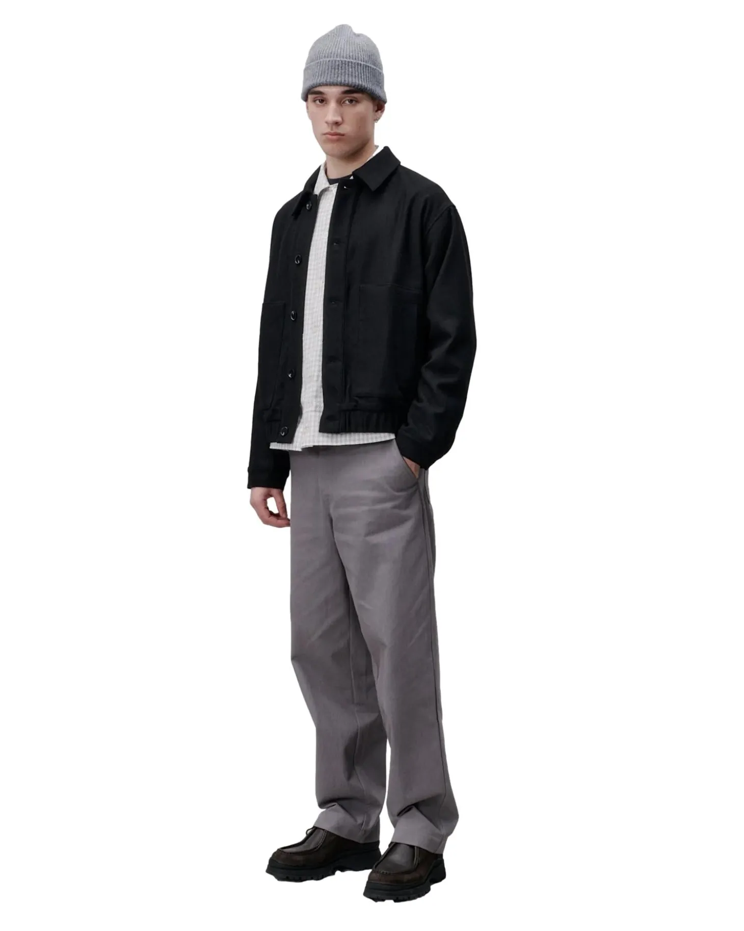 Laget av 69 % polyester, 6 % rayon, 23 % ull, 2 % spadex.