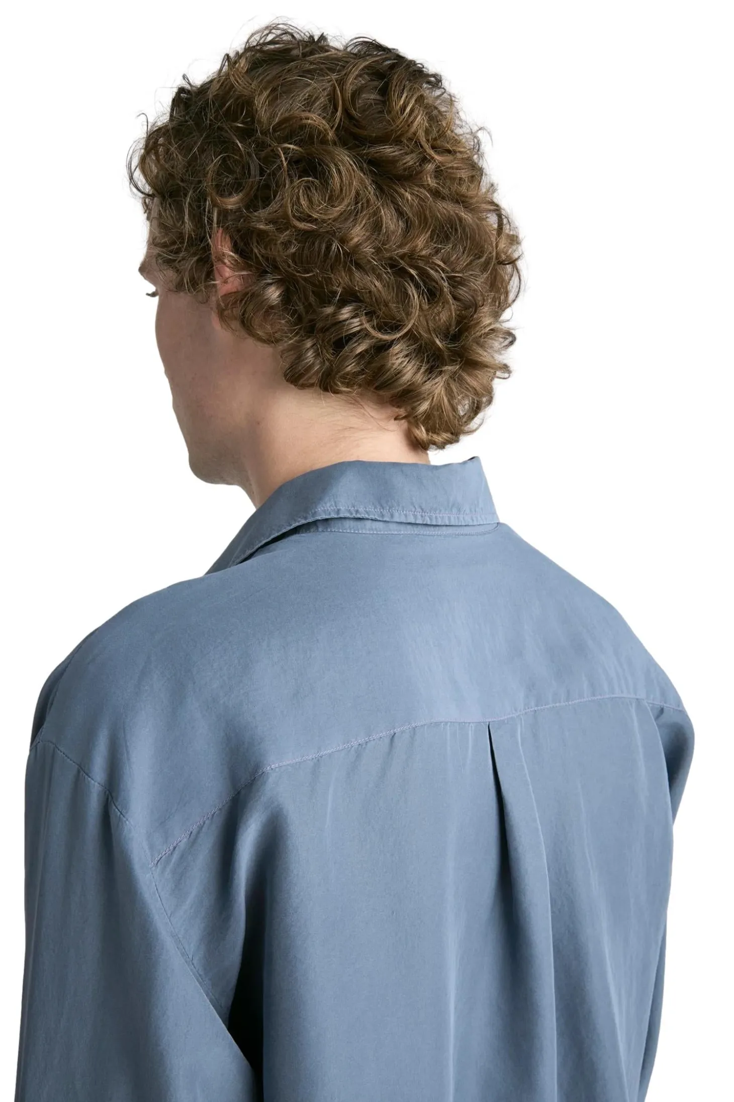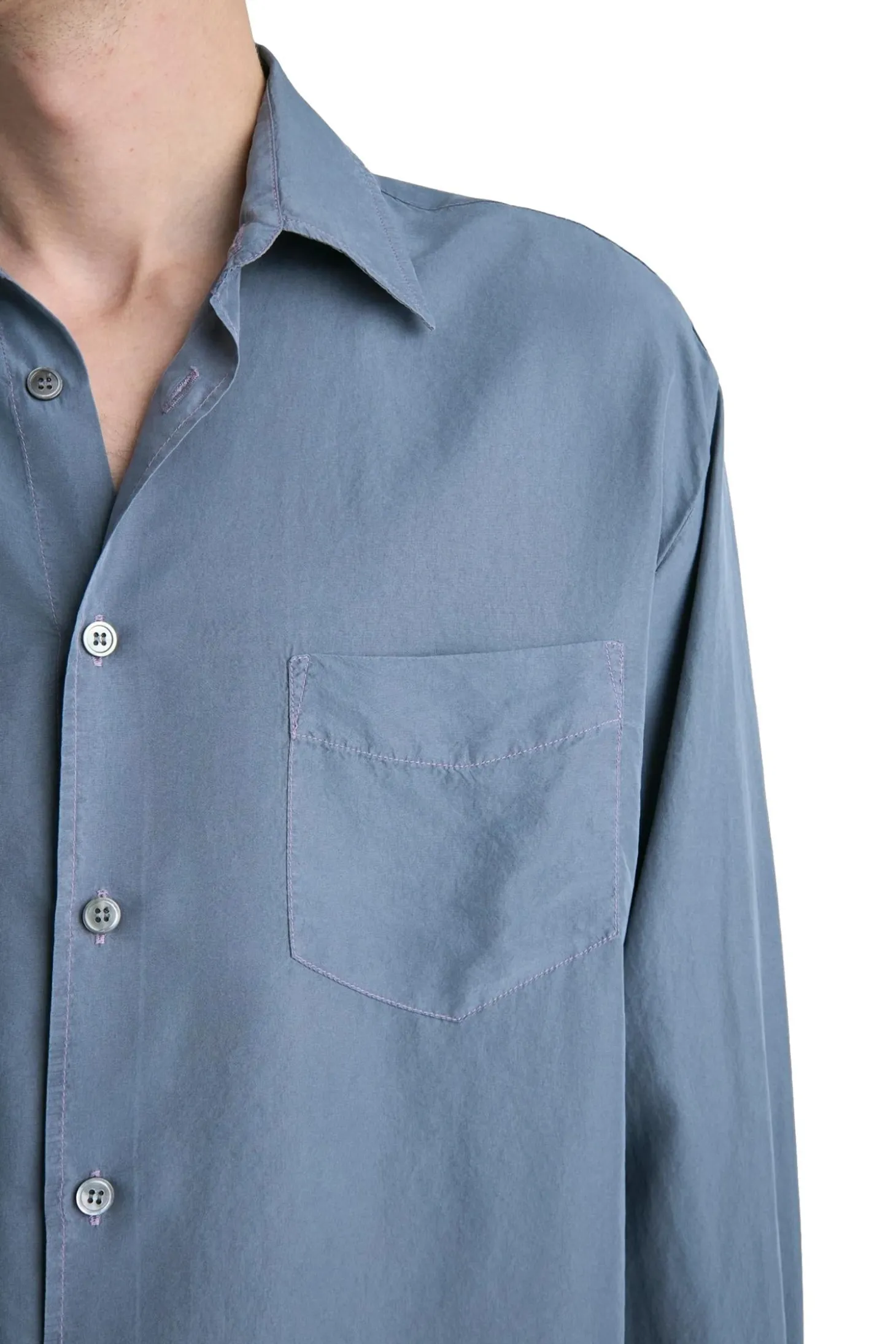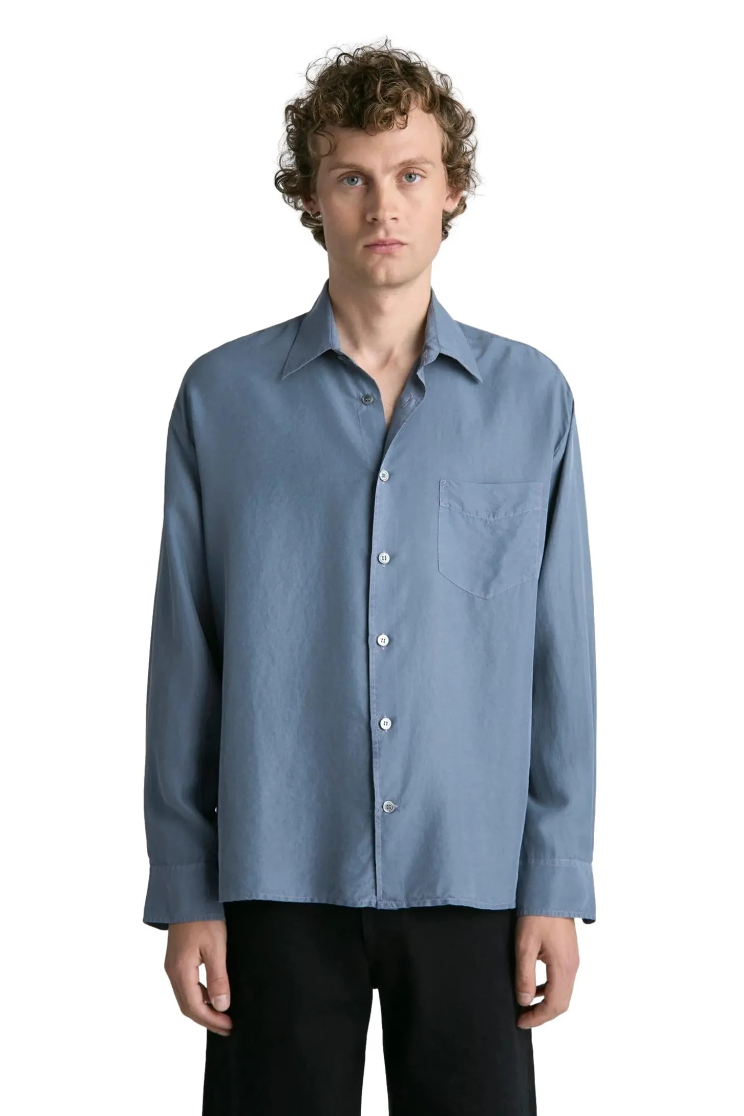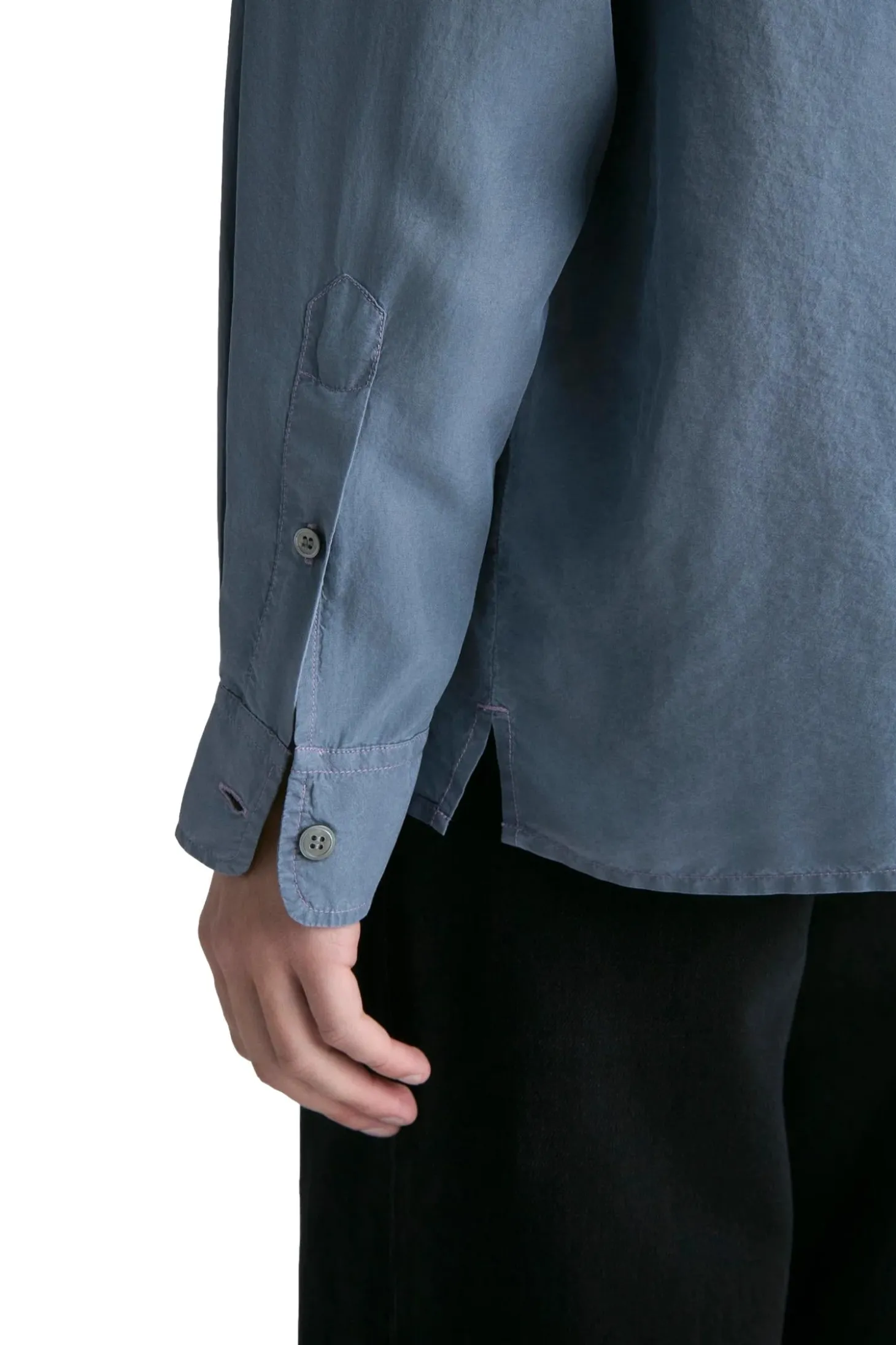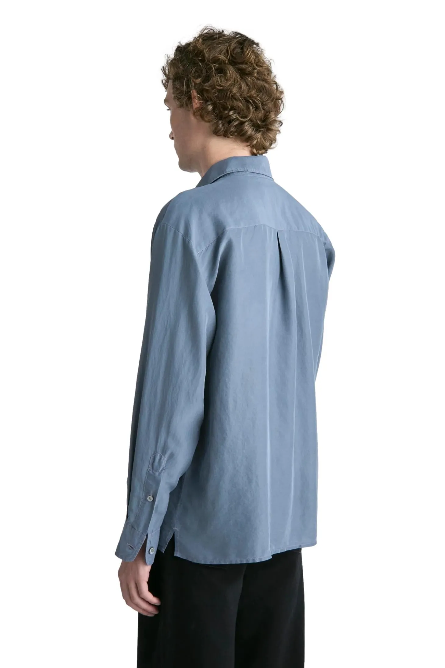 Plagget er farget og vasket ned, noe som gir silkestoffet en mykere farge med en subtil variasjon og dybde. Designet med et sjenerøst rett snitt og beregnet for vanlig lag-på-lag-bruk. Med en box-fold bak på bærestykket og en fransk knappestolpe med naturlige perlemorknapper.
