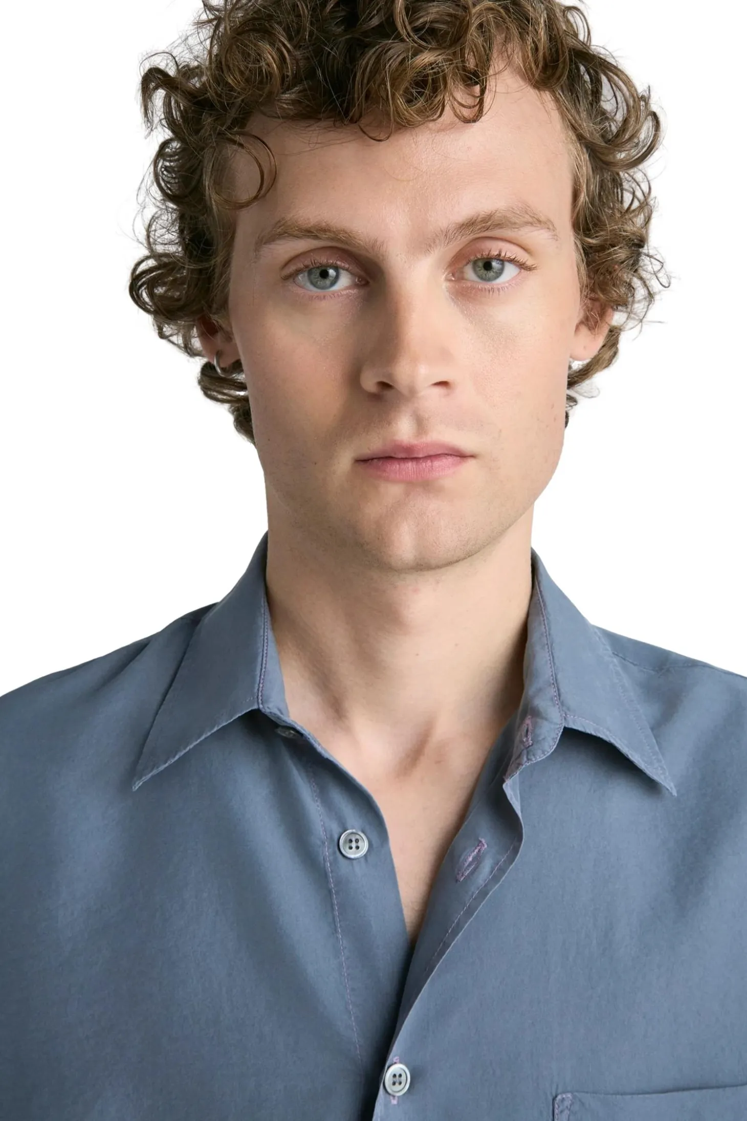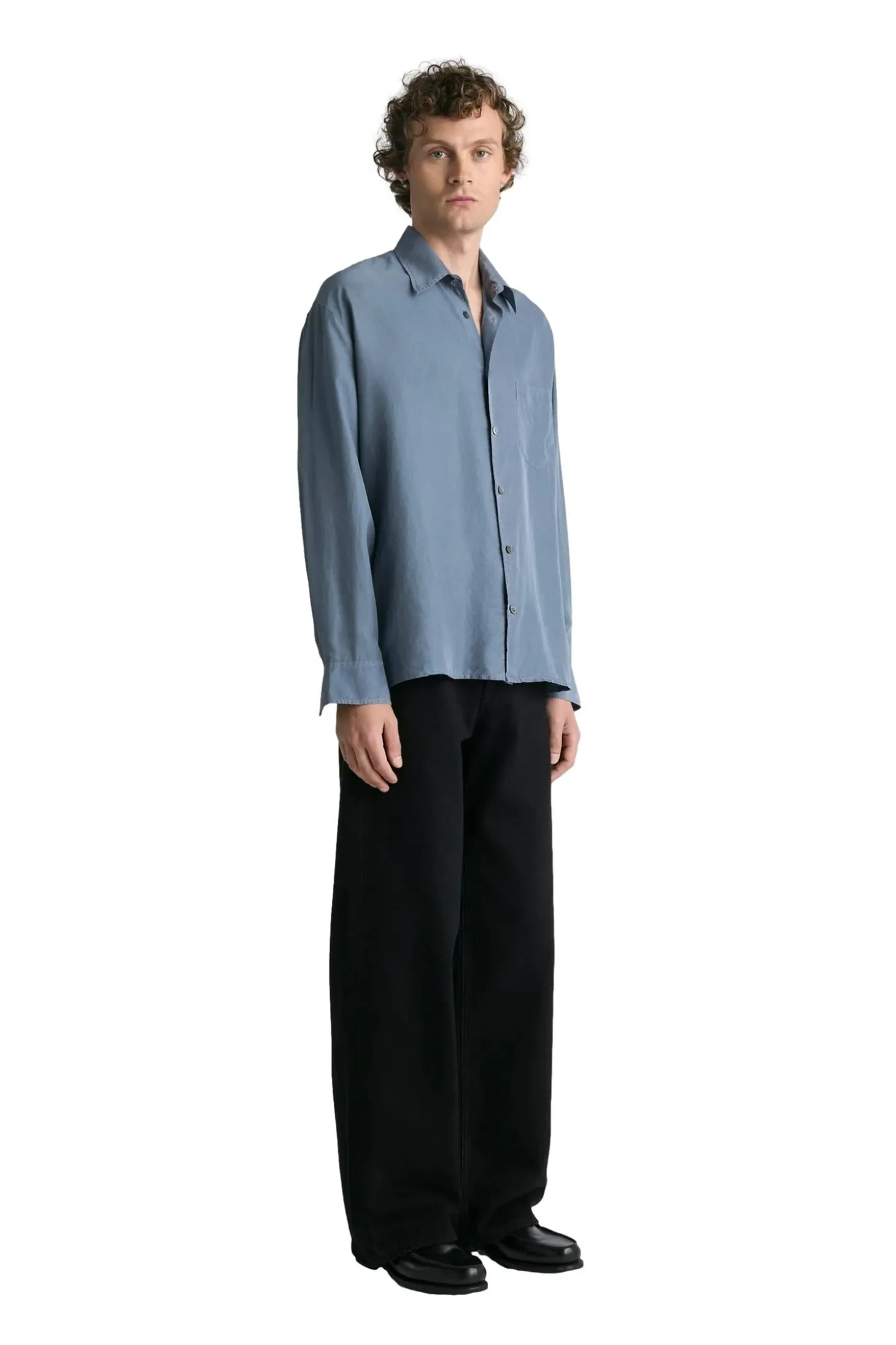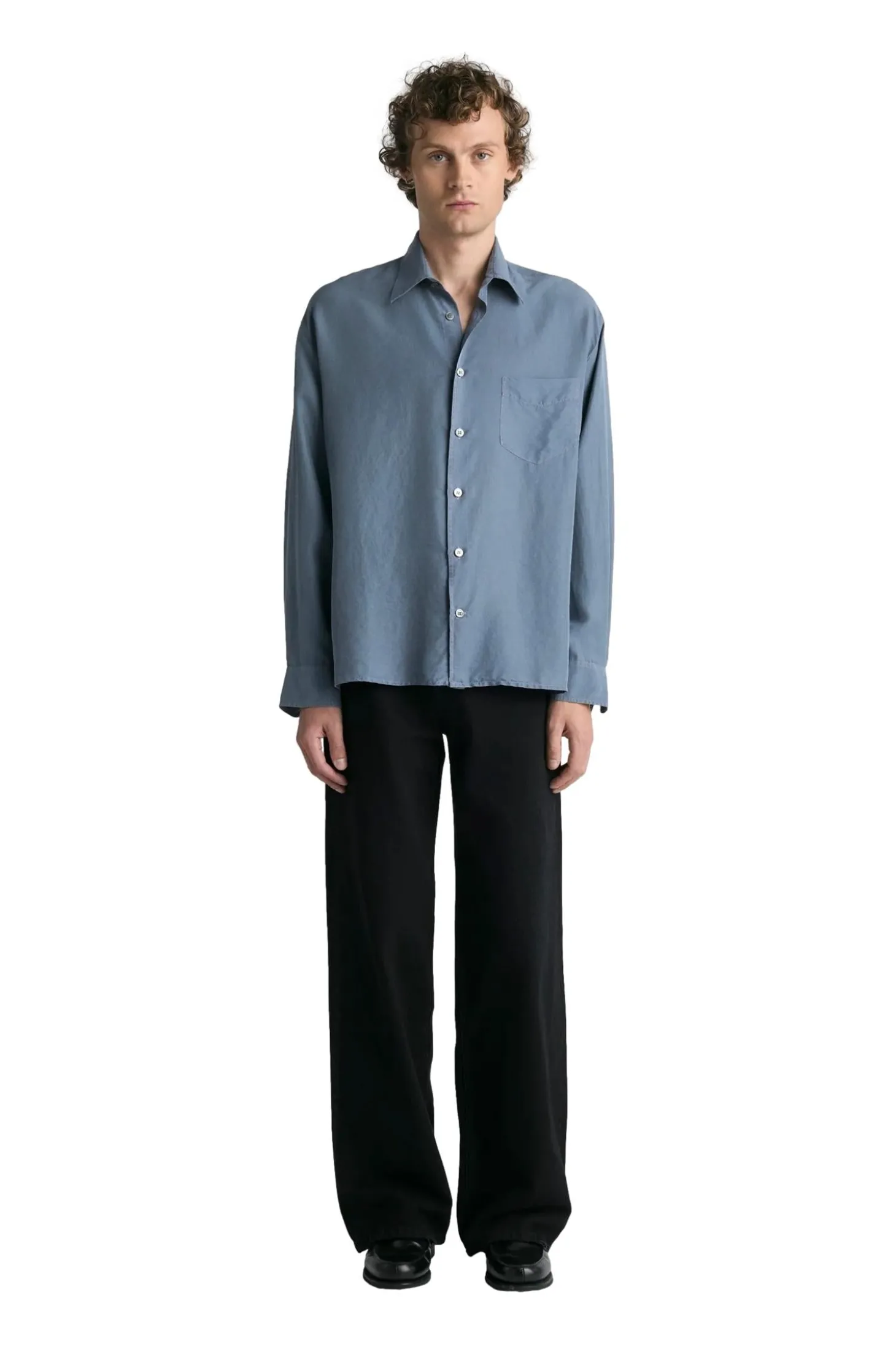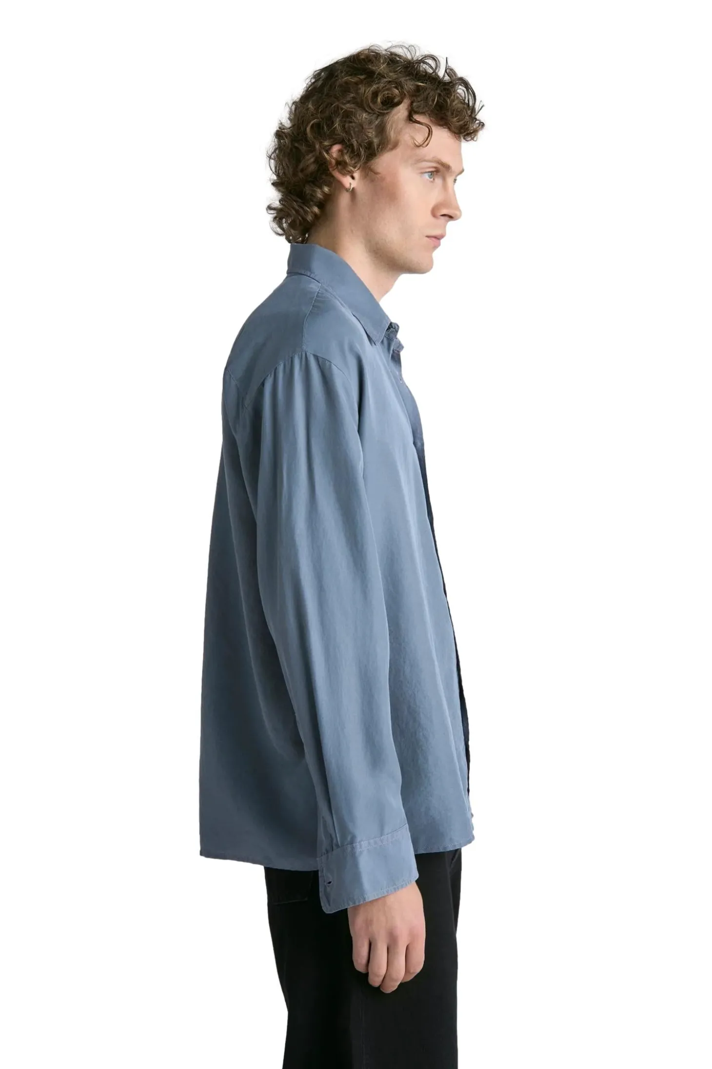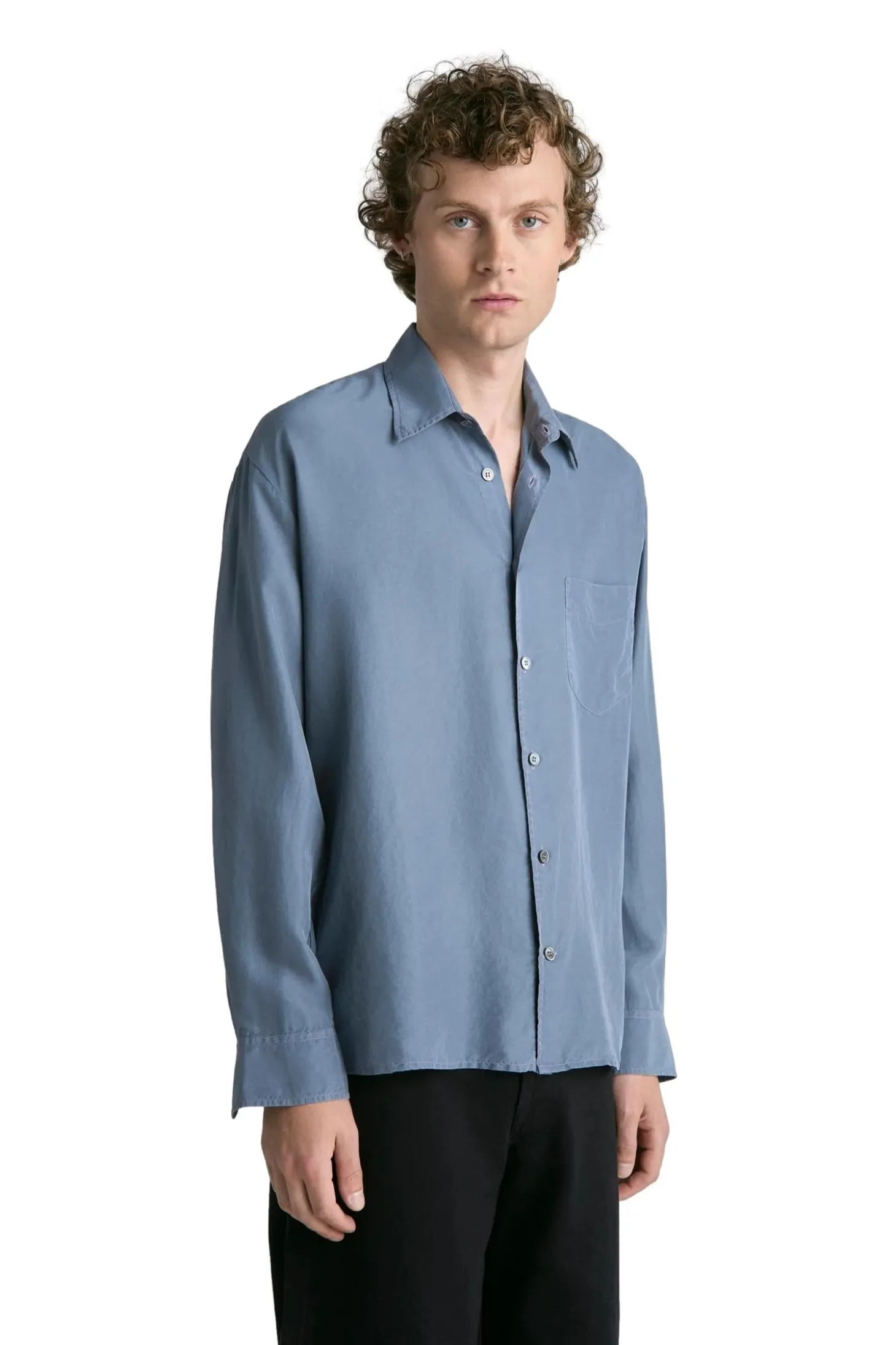 Plagget er farget og vasket ned, noe som gir silkestoffet en mykere farge med en subtil variasjon og dybde. Designet med et sjenerøst rett snitt og beregnet for vanlig lag-på-lag-bruk. Med en box-fold bak på bærestykket og en fransk knappestolpe med naturlige perlemorknapper.