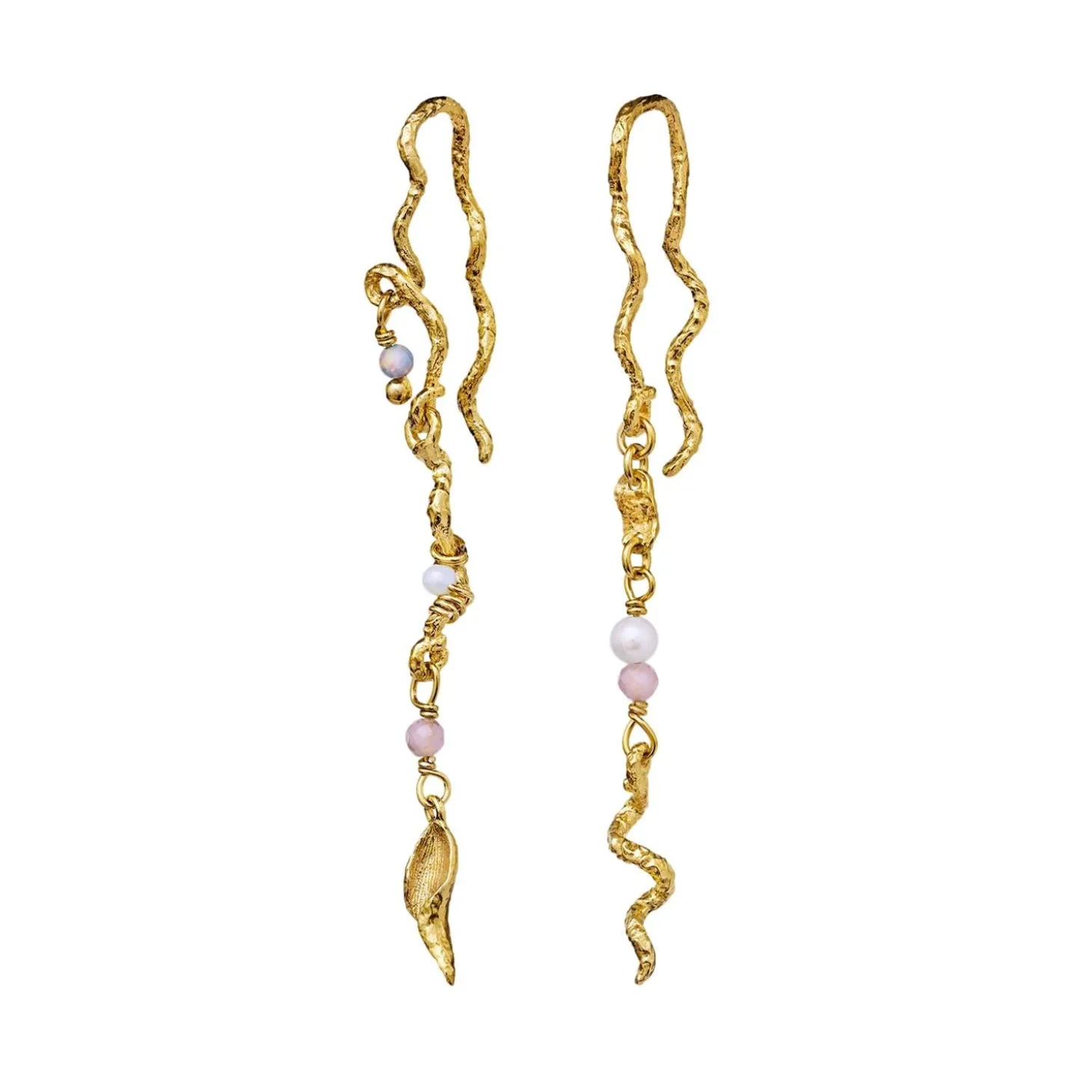 Elisa øredobber er økologiske fra rot til spiss. De faller fra øret som lett krøllete, slanke spirer, hvorfra små glitrende skatter i form av eventyrlige, små blå opaler, akvamarin og fine ferskvannsperler titter frem og danner et magisk, forlokkende fargespill.