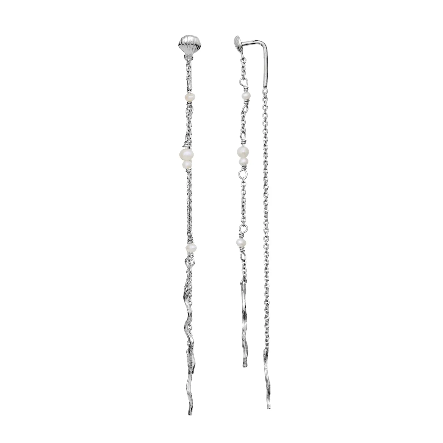 Lange kjeder faller elegant fra Sirena øreringen som en liten vannstråle fra øreflippen, langs halsen, med små glimt fra dråper fra ferskvannsperler.