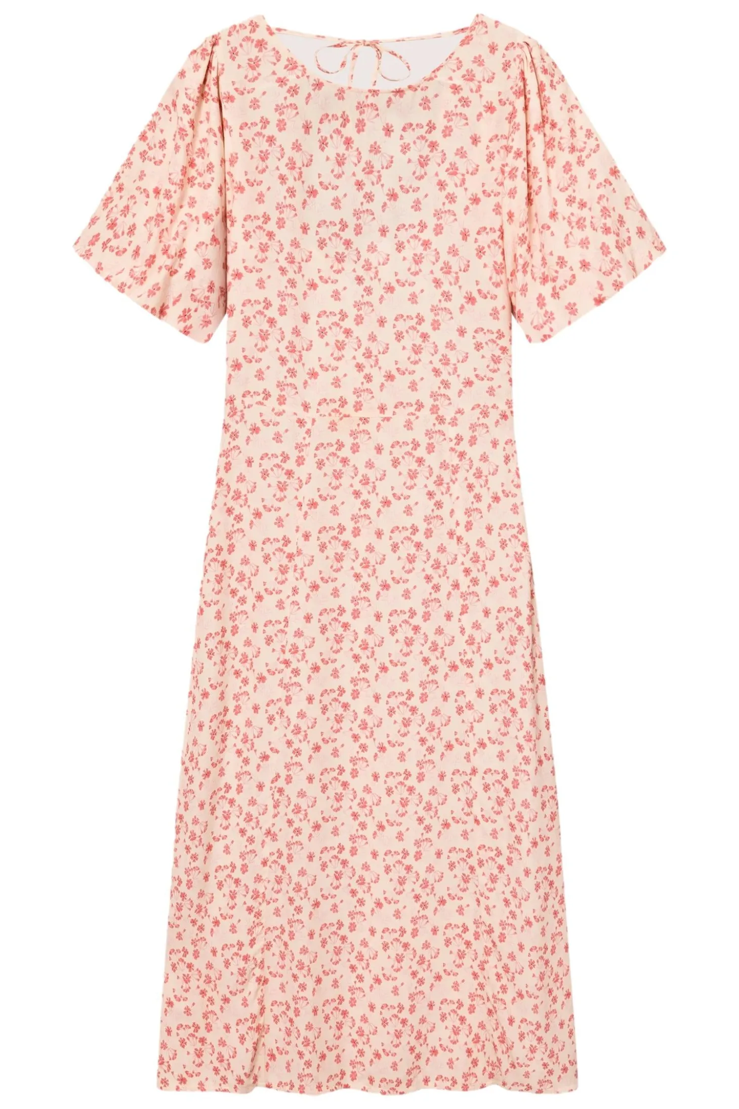 Kjole med rund hals og åpen rygg. Korte ermer.