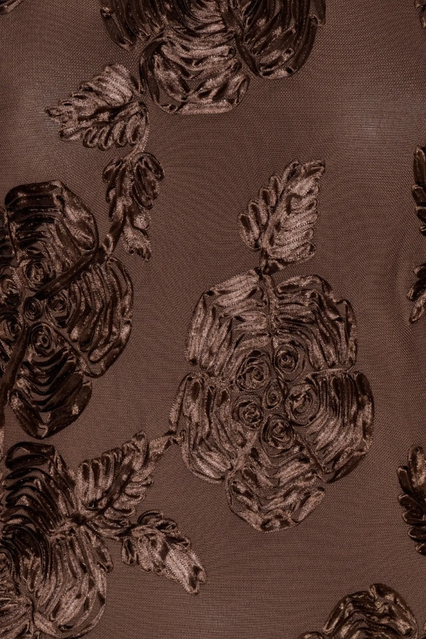 Flower Mesh Minikjole Mørkebrun er en tettsittende minikjole med lange ermer og utsvingte mansjetter. Den er laget av en gjennomsiktig nettingbunn med hevet blomsterbroderi overalt. Kjolen har rund hals og en kort fald. Den er fôret.