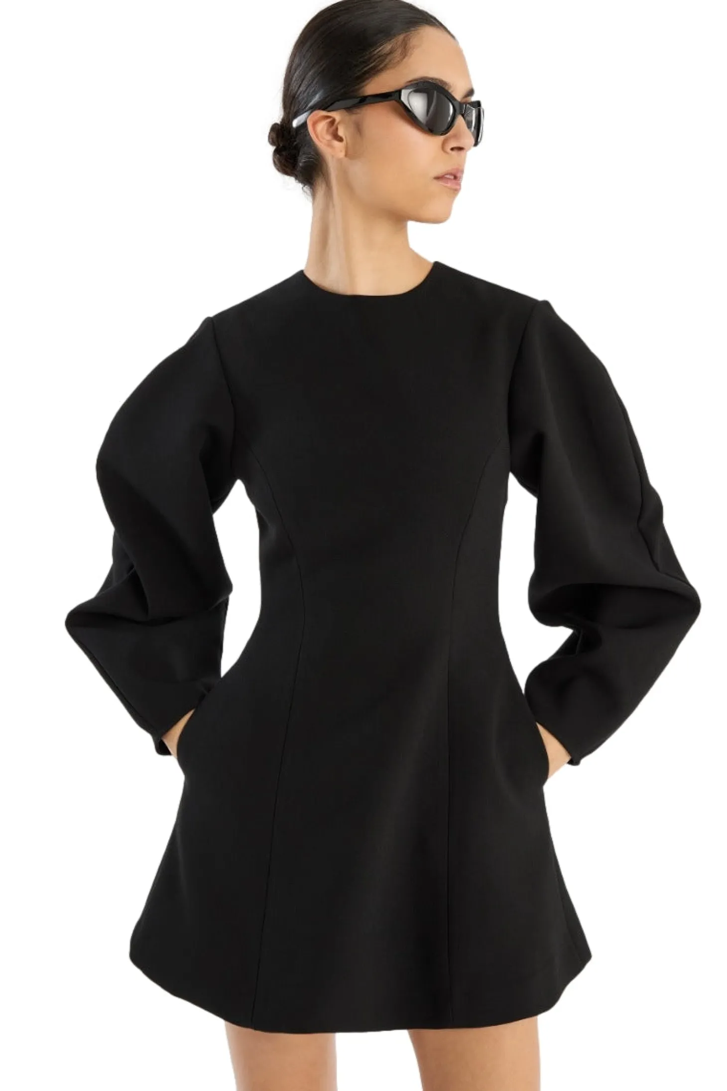 Suiting Flared Mini Dress Black er laget av strukturert resirkulert polyester og har en tettsittende overdel med utsvingt kant. Designet inkluderer voluminøse lange ermer og en rund hals. Baksiden har en dråpeformet åpning med knappelukking. Kjolen har fôr.