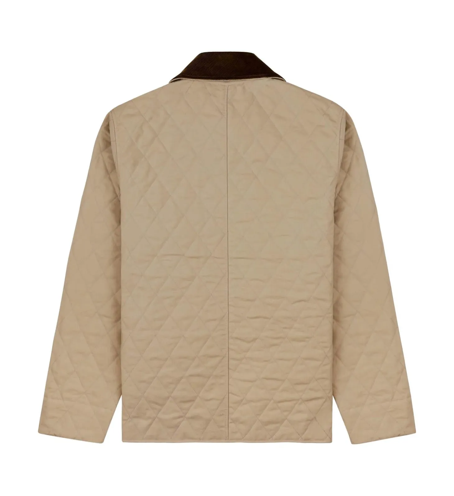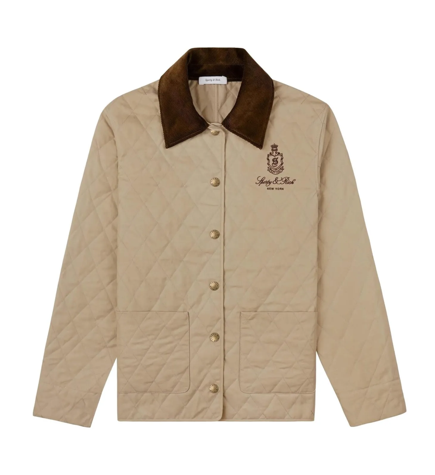 Kviltet jakke med logo på brystet som lukkes med trykknapper.