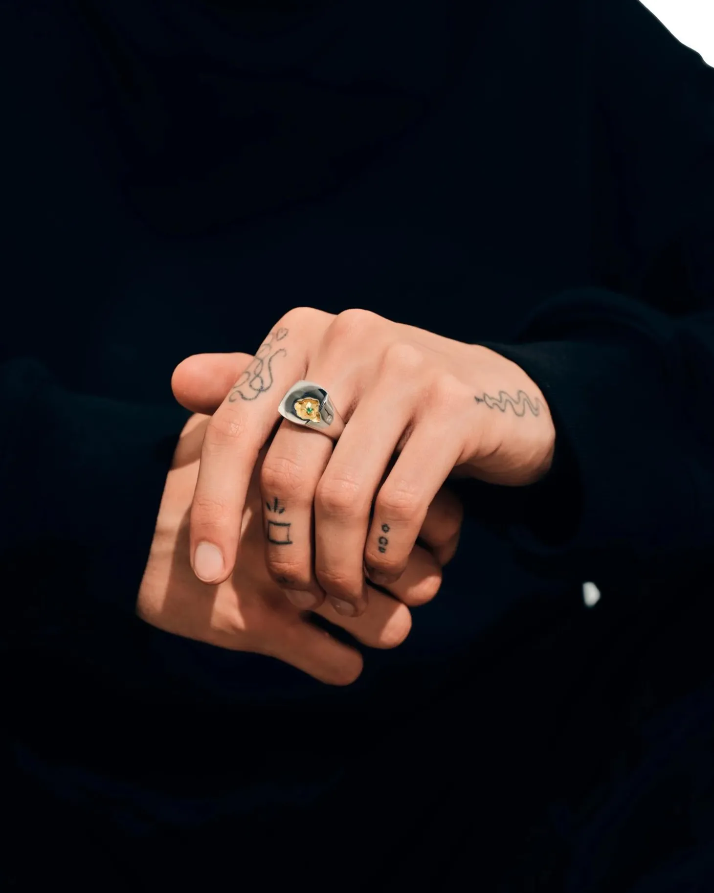 Inspirert av den steinete kystlinjen i Norge mot den rene overflaten av sølvhavet, etterlater Mined Ring en råhet til vår klassiske Cushion-signetring. Den grove rillen med en håndsettsmaragd minner oss om strandblomstene som vokser inne i fjellskråningene, som fører ned til havet.