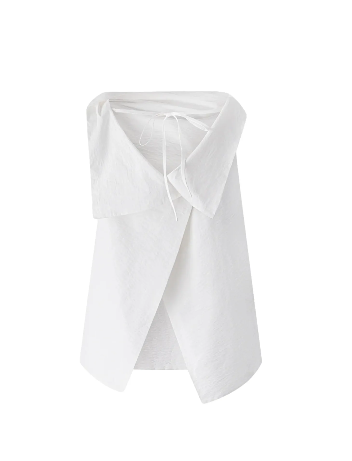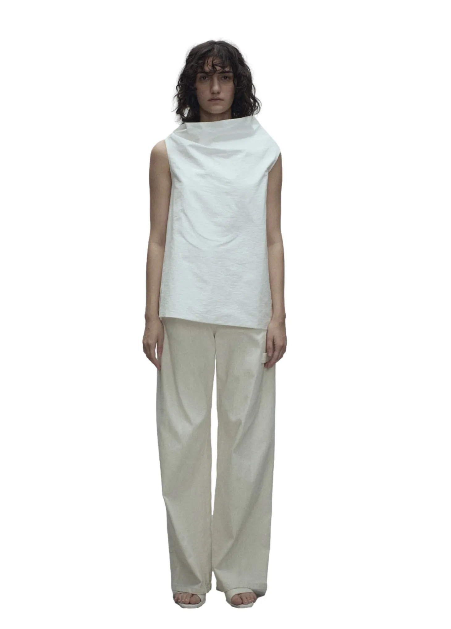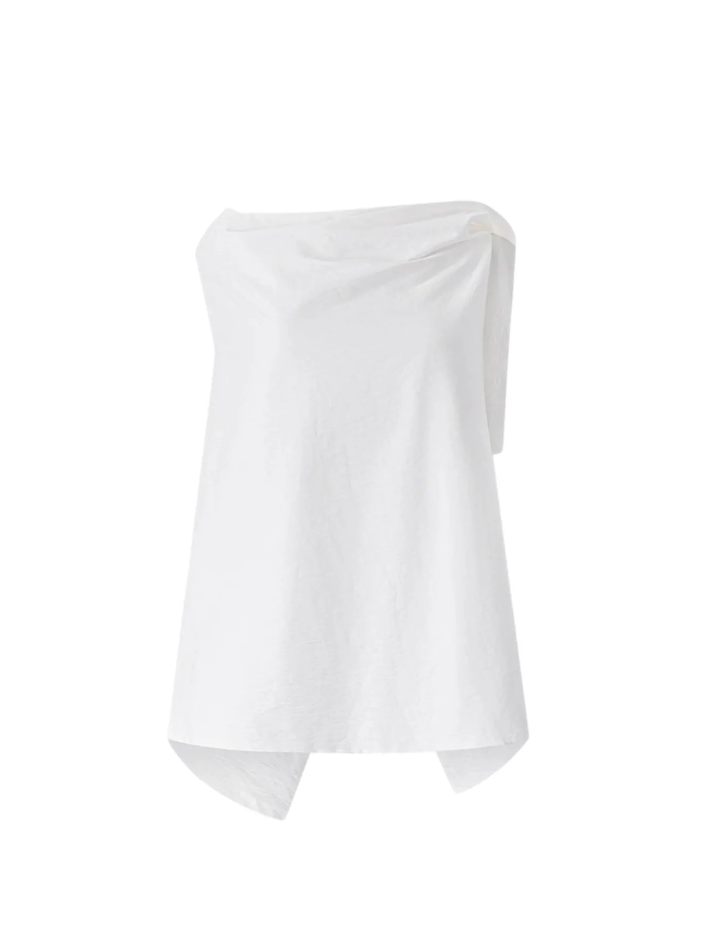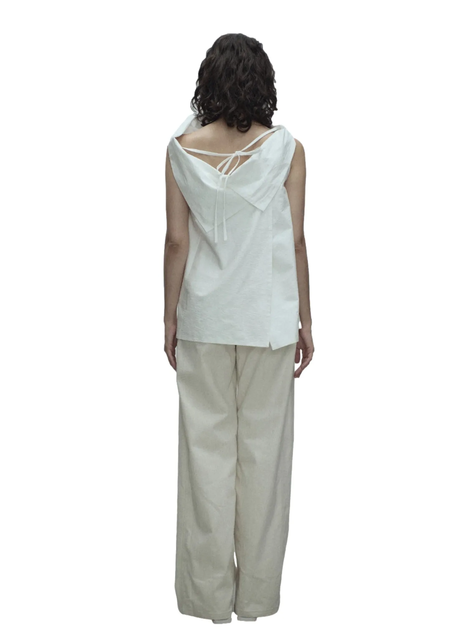 Åpen rygg i bomullsblanding topp med høy krage som er løs og lett drapert. Øvre rygg er åpen og utsmykket med en sløyfedetalj. Spalteeffekt skapt bak ved måten toppen er festet på