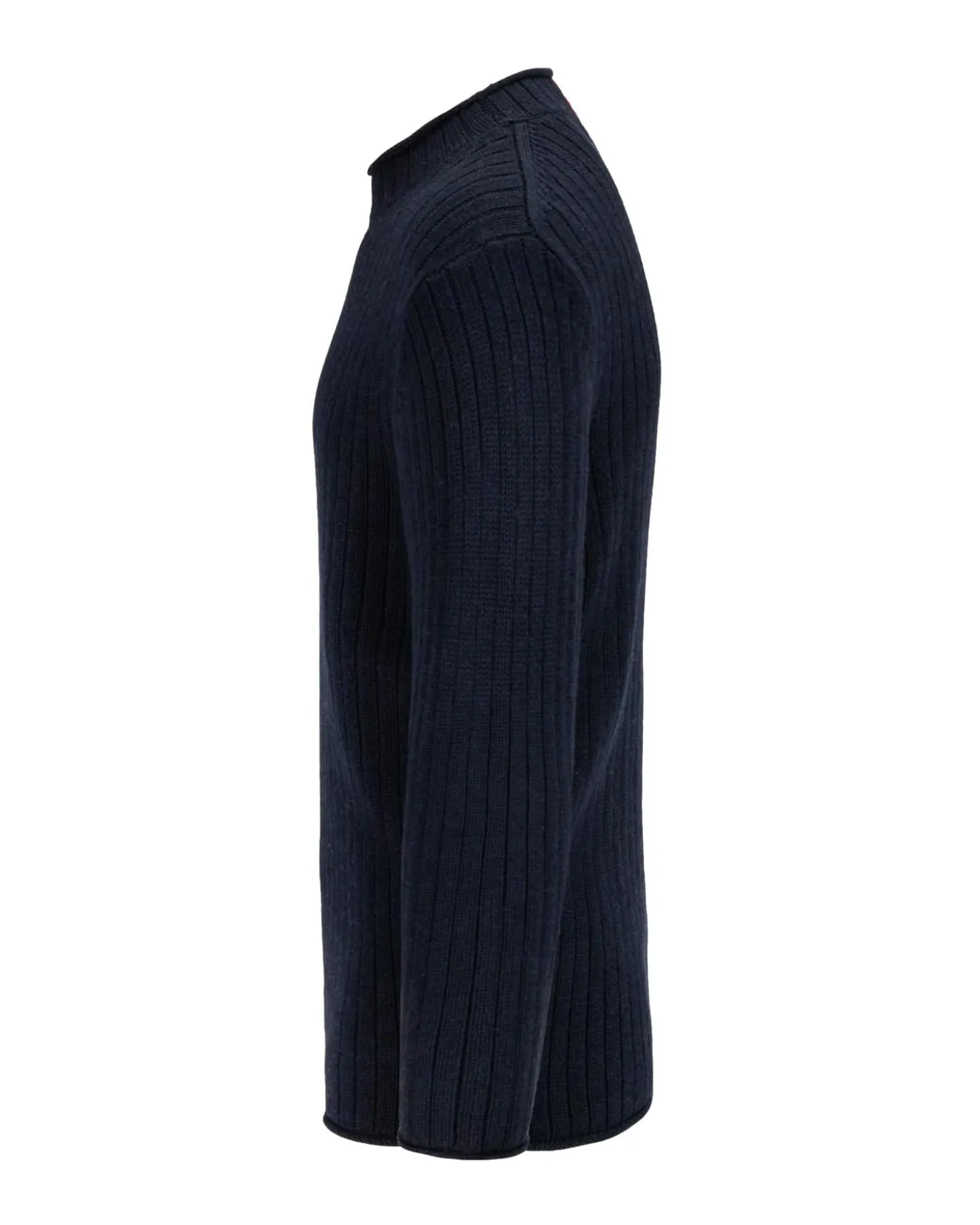 Løst ribbestrikket merinoullgenser med rullehals som er allsidig på tvers av sesonger og aktiviteter.