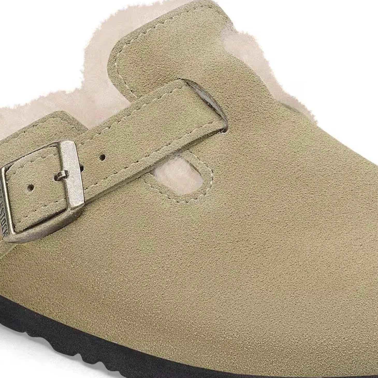 Helst i en klasse for seg! Treskoen Boston, en klassiker blant BIRKENSTOCK-modellene viser seg her frem i en spesielt god variant i ekte semsket skinn med svært høy kvalitet. Den naturlige lammefellsdekksålen og reimene som er underfôret med lammefell, virker stilige og sørger for varme føtter. Den egnede skoen for koselige vinterkvelder ved kaminen!