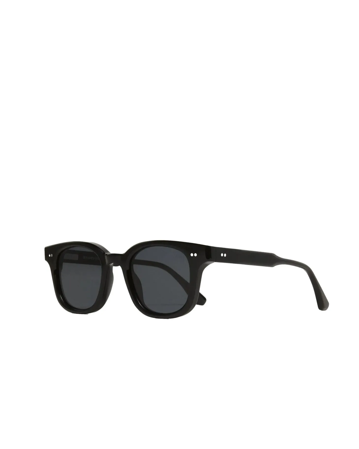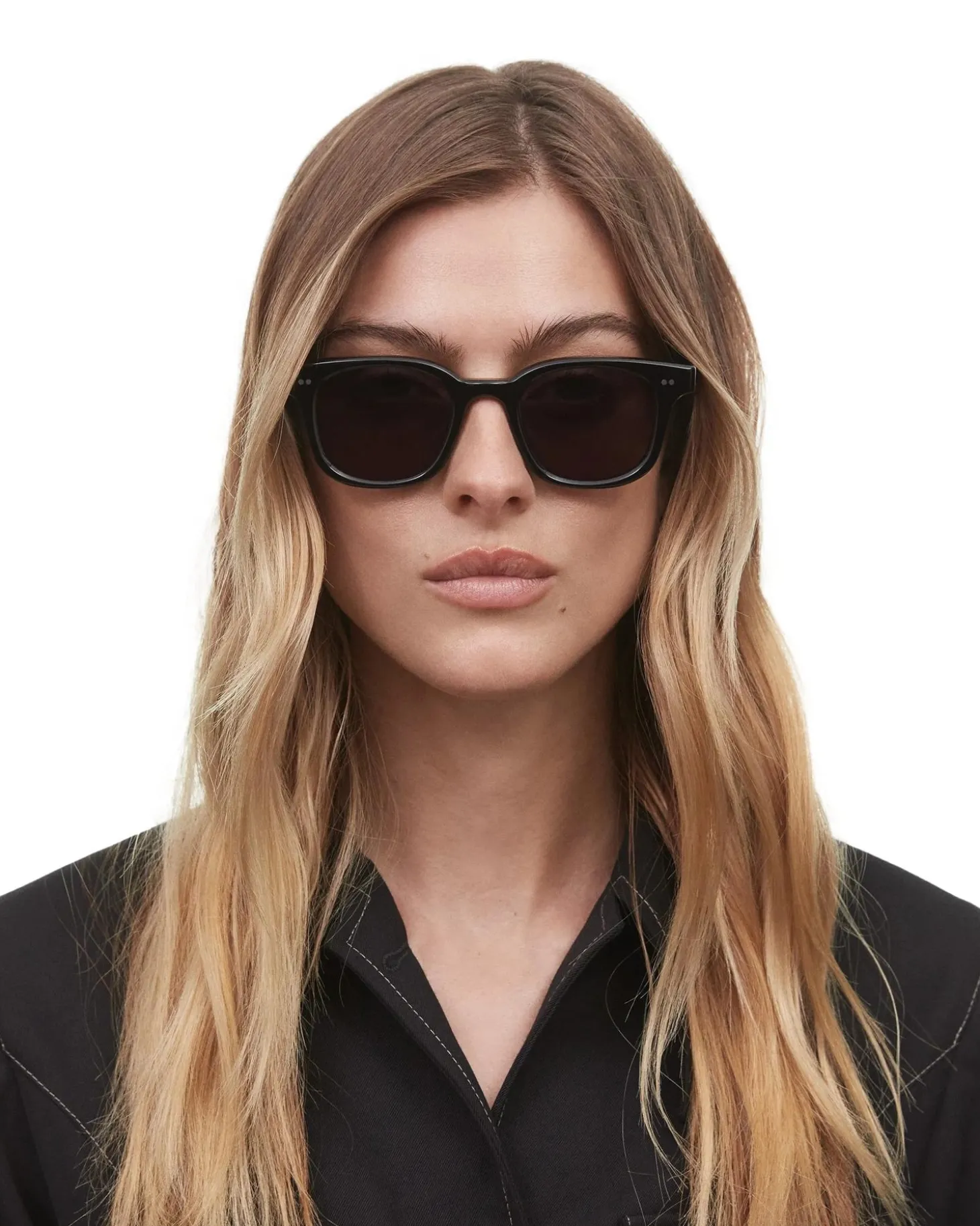 02 er en sofistikert konisk silhuett med omhyggelige dimensjoner og en slank profil detaljert med sølvfargede naglehengsler. Distinkte skråsnitt rammer inn de UV-beskyttende CR39-linsene.