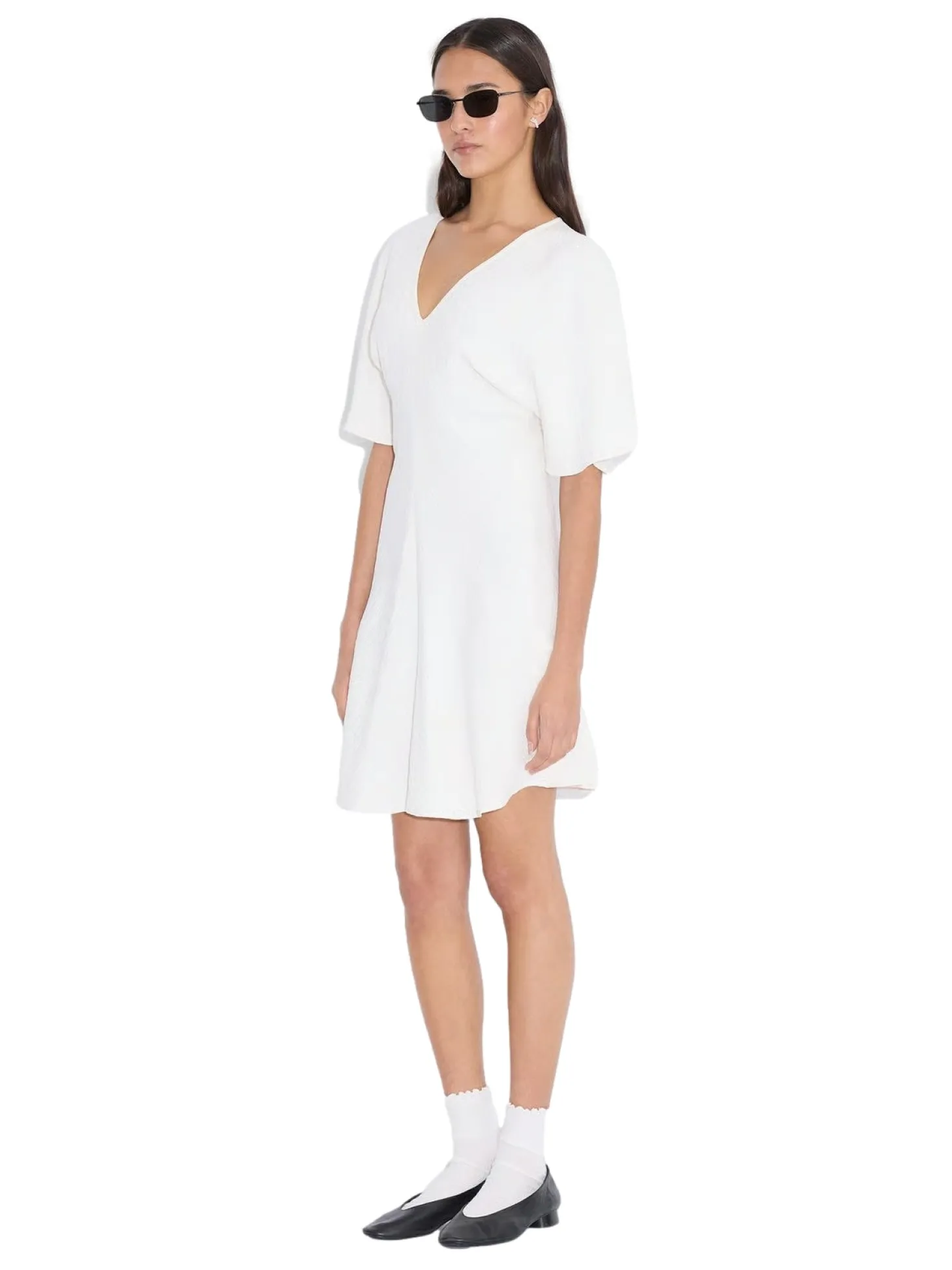 Kortermet kjole med v-hals og innsving i midjen.