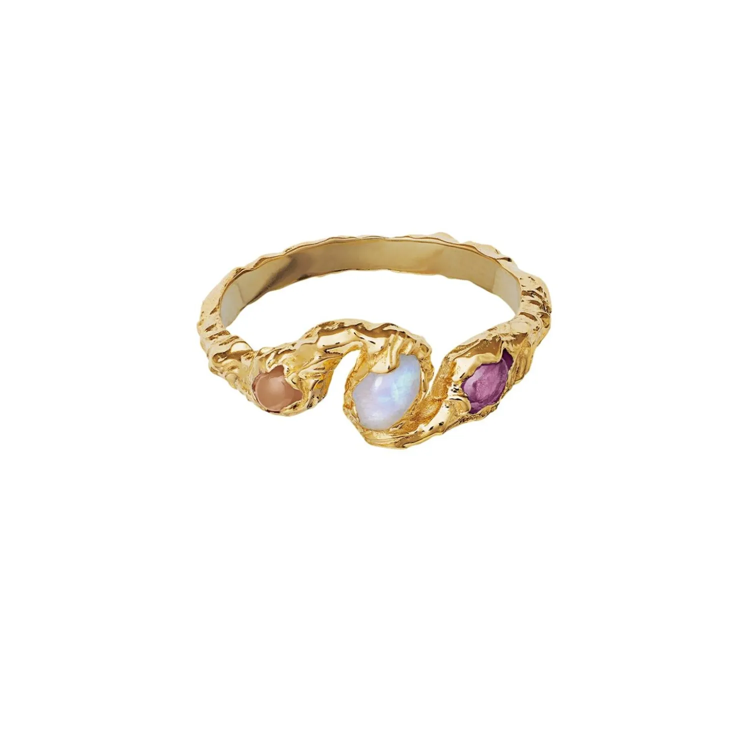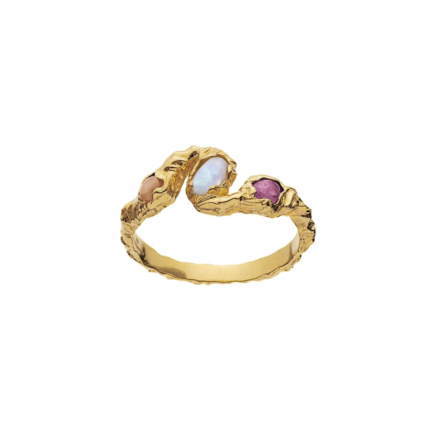 Håndlaget gullring med perler i forskjellige farger.
