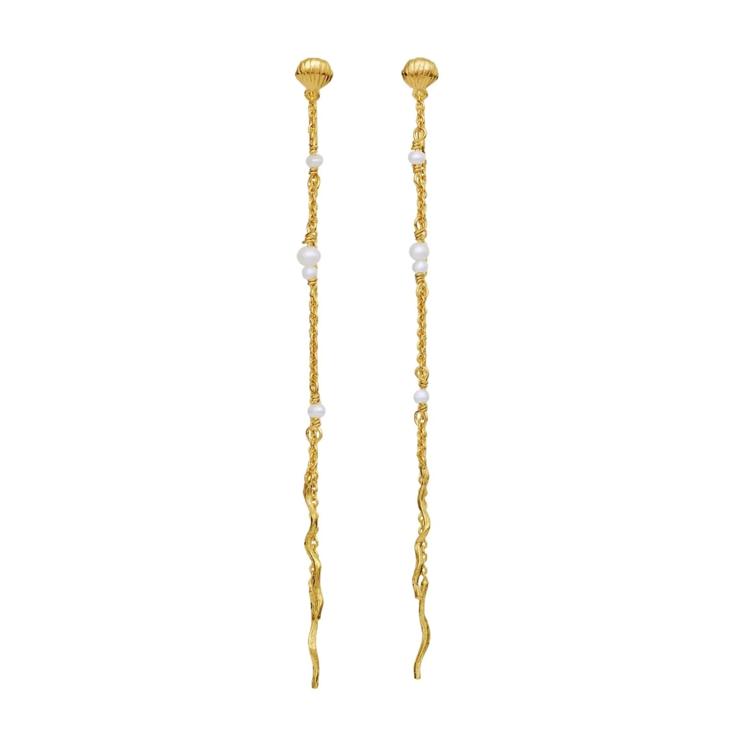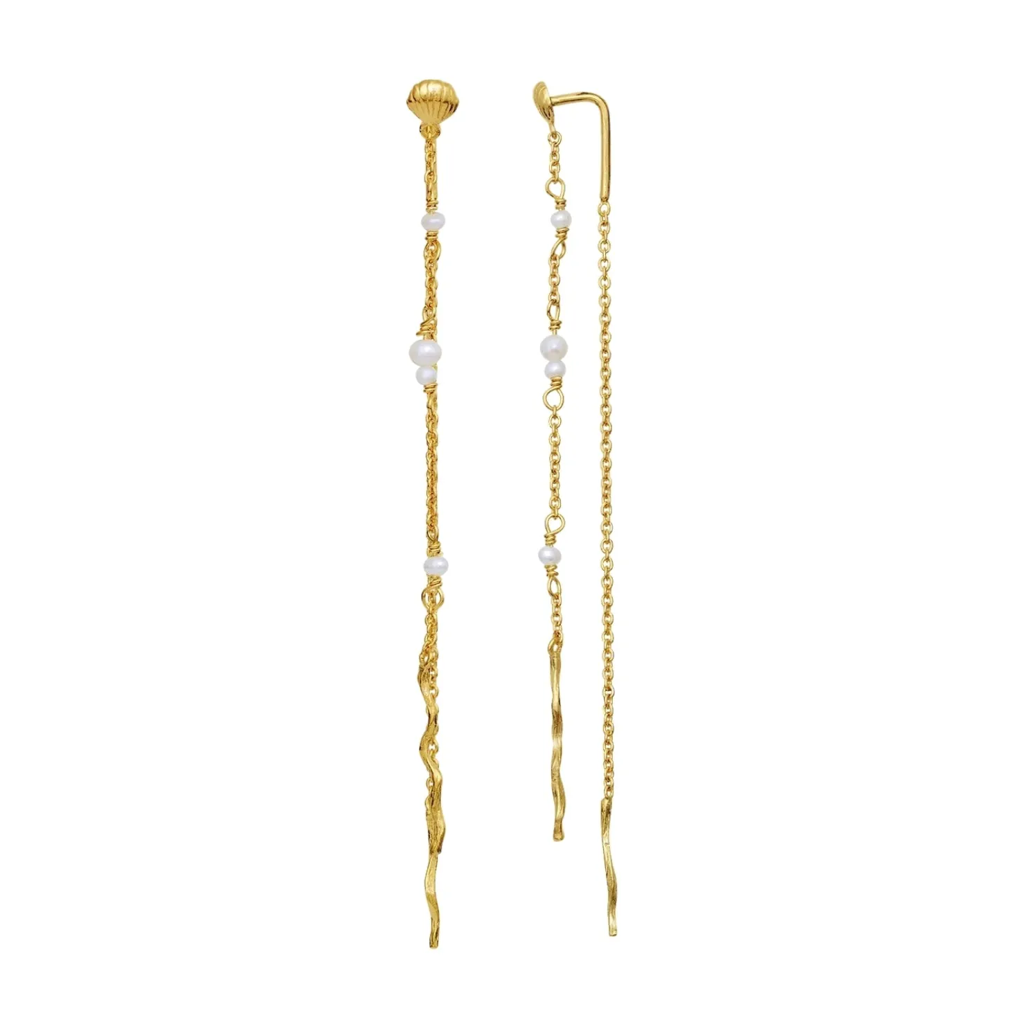 Lange kjeder faller elegant fra Sirena øreringen som en liten vannstråle fra øreflippen, langs halsen, med små glimt fra dråper fra ferskvannsperler.