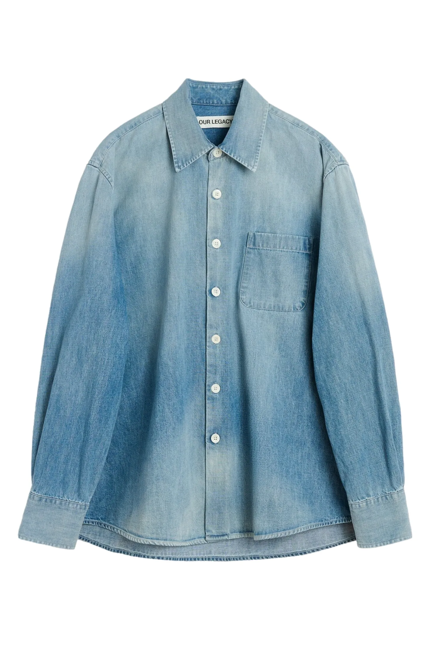 Herreskjorten Above Shirt er produsert i italiensk økologisk bomullsstoff med en vintage denimvaskbehandling, har en litt oversized passform og har en enkelt brystlomme, perlemorknapper, gjærede mansjetter og en buet fald.