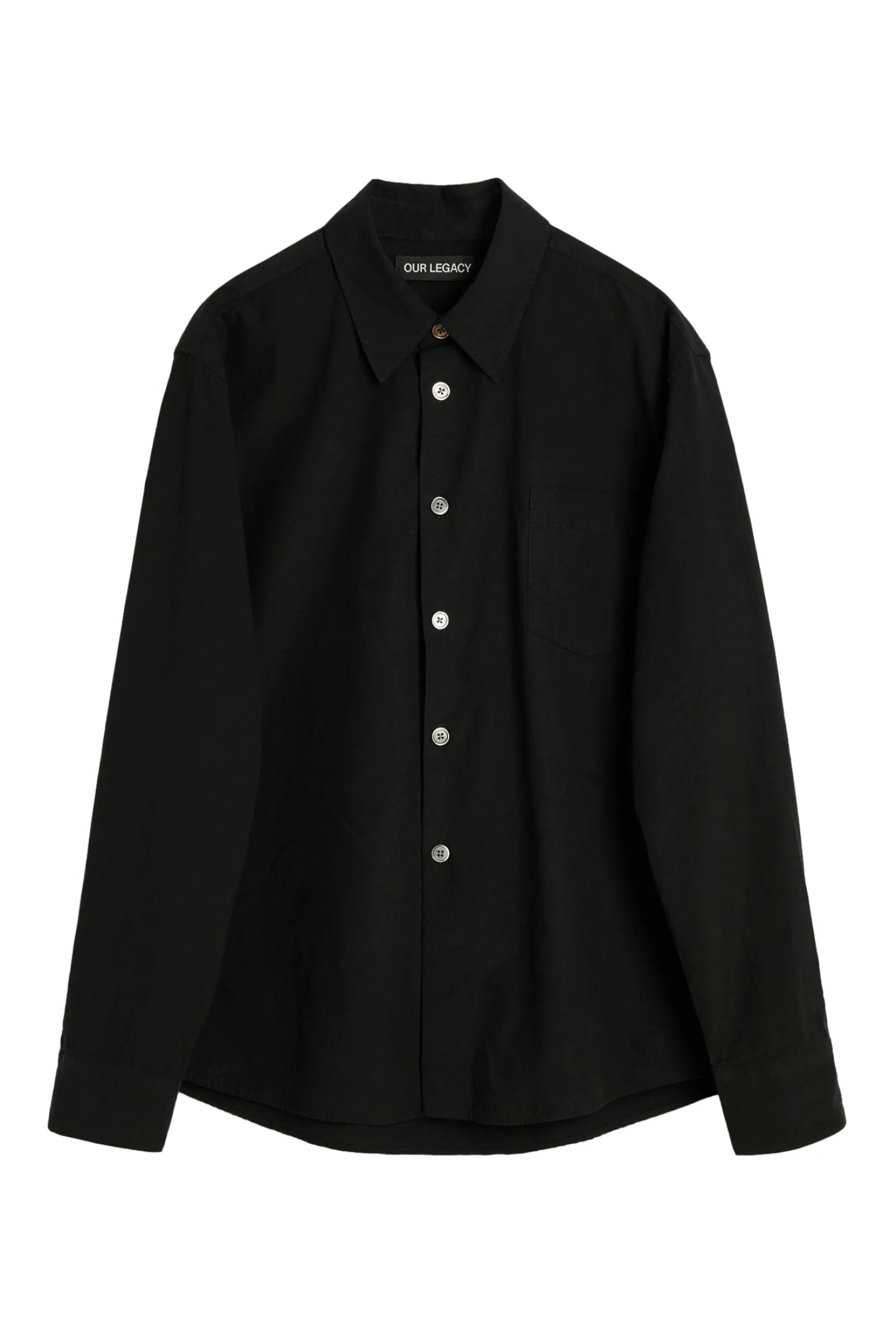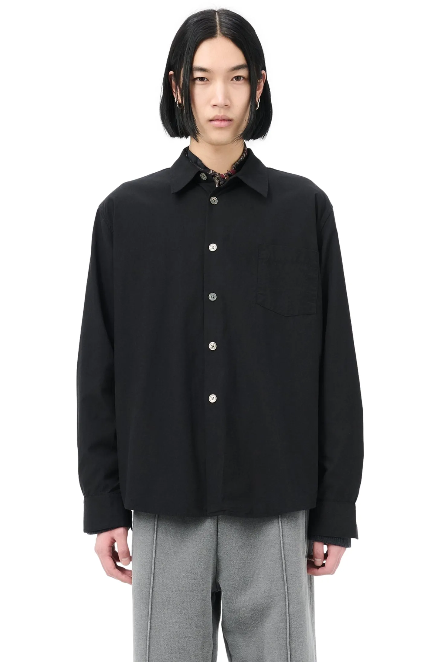 Beyond-skjorte i svart, casual Liquid Poplin. Produsert i kinesisk poplinstoff laget av lyocell og bomull, har denne Beyond-skjorten for menn en vanlig, rett passform med perleknapper, en buet kant og rett kroppskonstruksjon.