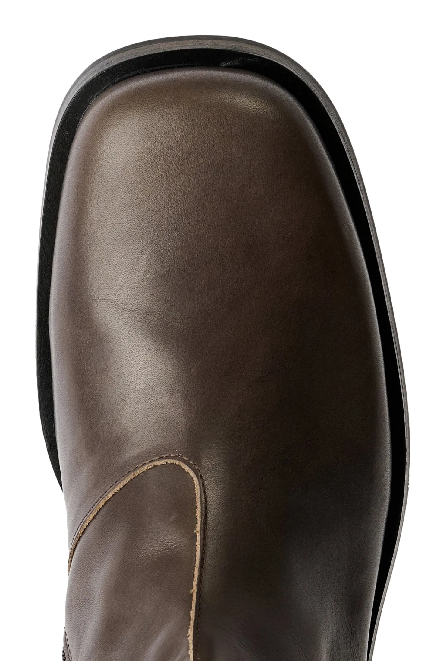 Produsert i italiensk kalveskinn med en gråbrun tone, har Camion-støvelen en Vibram-yttersåle laget i USA, en Kilger-mellomsåle i skinn fra Tyskland, YKK-glidelås på siden, metallnagledetaljer i Our Legacy og er helfôret i skinn.