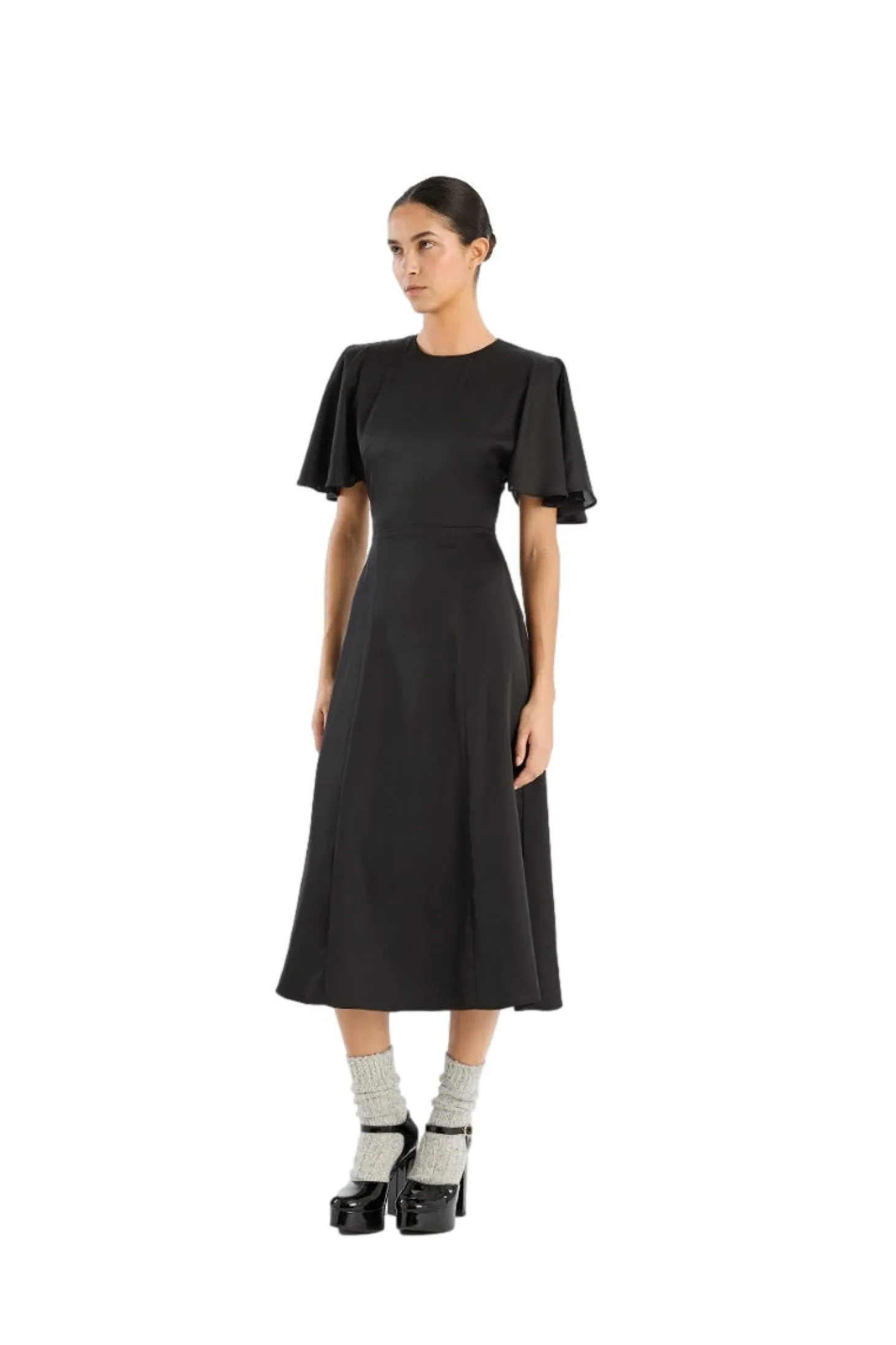 Chiffon Midi-kjolen i svart har rund hals og mykt utsvingte korte ermer.