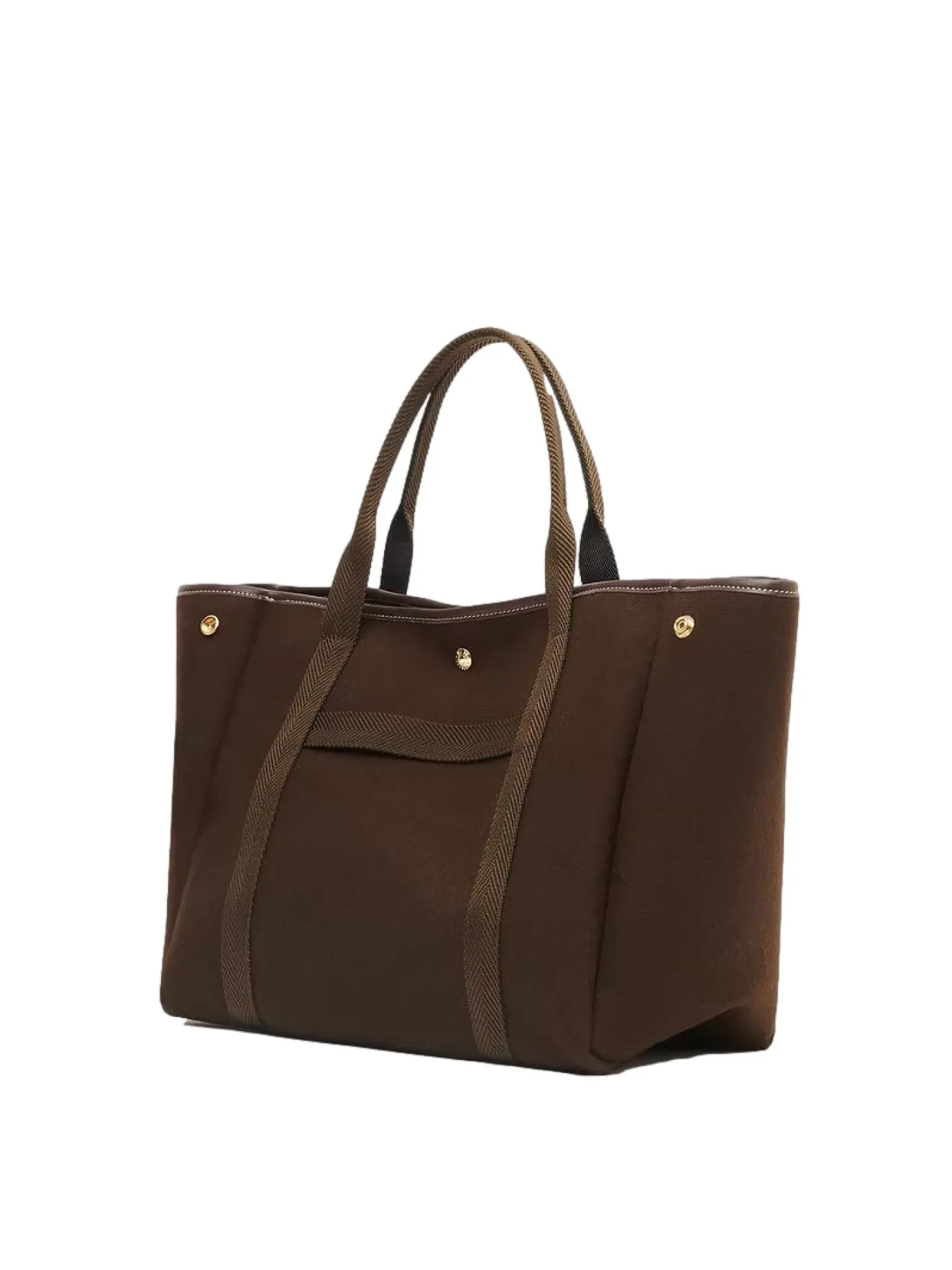 Stor Traversée Whip-veske, som har fått navnet sitt fra hesteverdenen, er den ideelle håndbagasjen. Laget av sjokoladebrun flanell, har den brune håndtak og en horisontal brun stropp som kan skyves over håndtaket på kofferten din for å forhindre at den glir av. Håndtakene på denne modellen er tynnere enn på våre andre vesker, noe som gir den et sofistikert preg.
