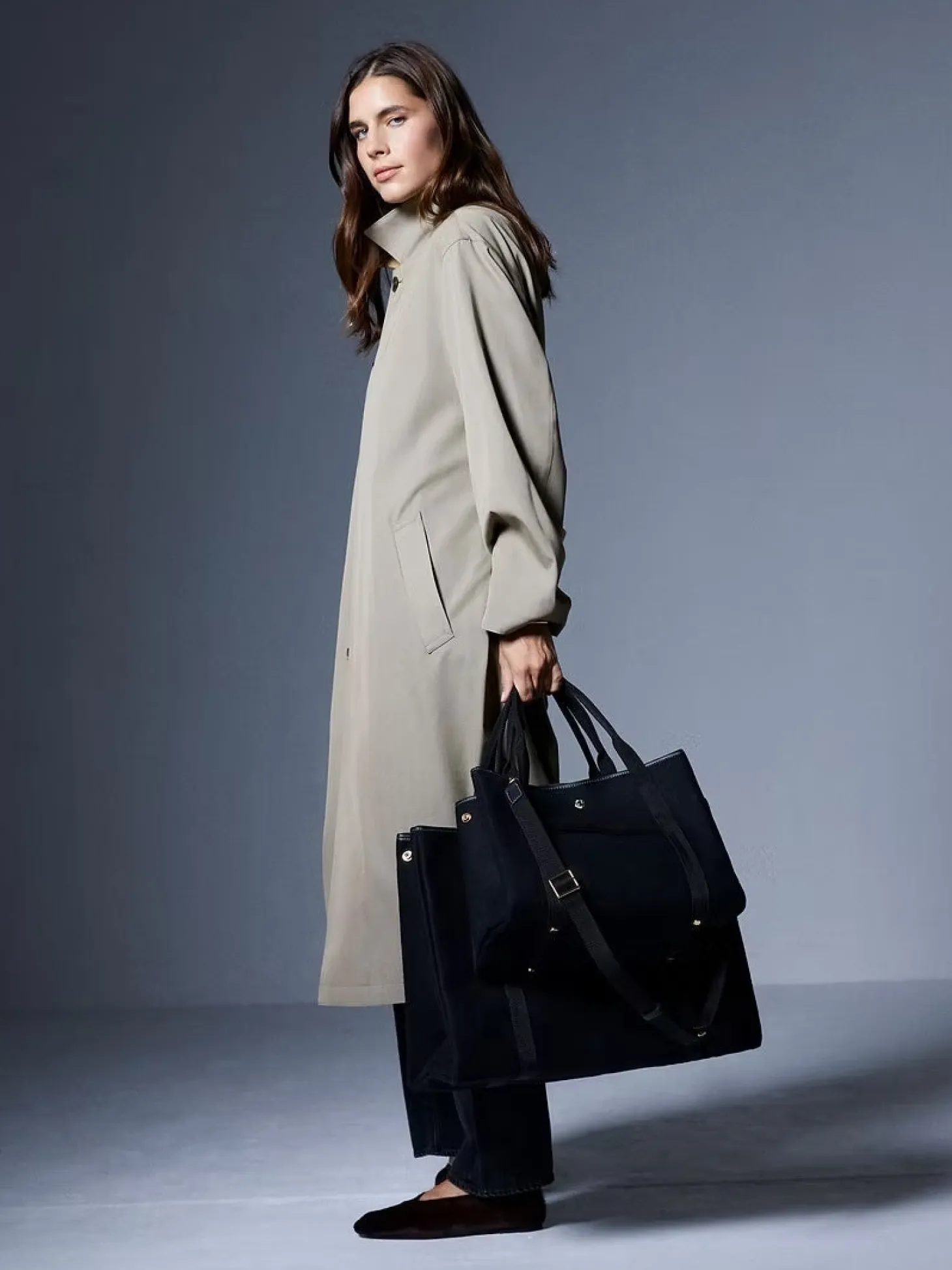 Designet har knapper på siden for å justere formen og størrelsen på vesken, mens to små innerlommer gir ekstra bekvemmelighet. Den kan bæres i hånden, over skulderen eller crossbody, ved hjelp av den avtakbare og justerbare skulderstroppen som følger med vesken.