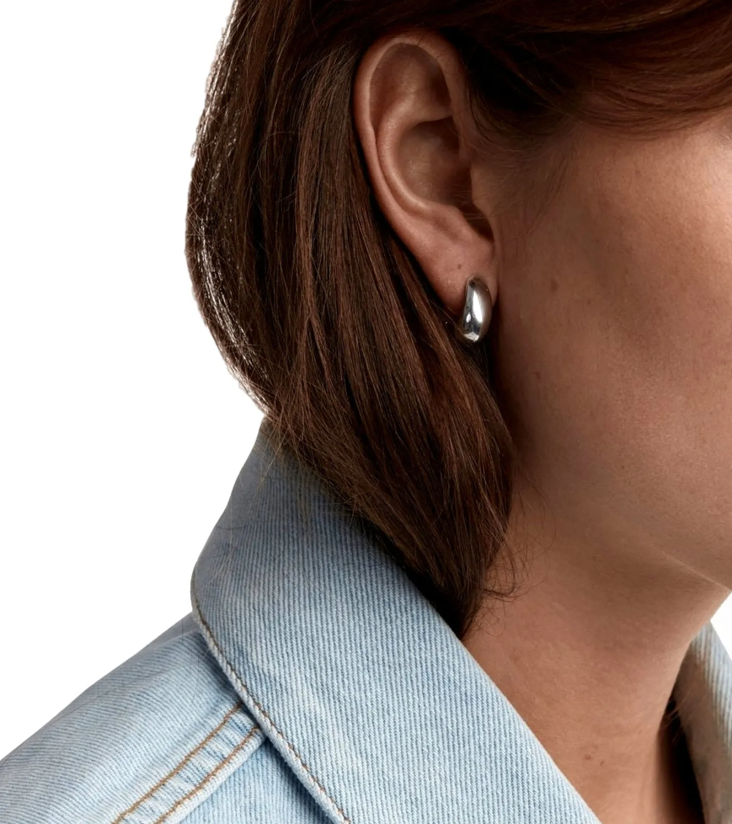 Ice Hoops Small er inspirert av måten isbiter har en tendens til å smelte til en mer buet og skinnende form. Ice Hoop er laget i resirkulert 925 sterling sølv av høy kvalitet, belagt med hvit rhodium for å styrke overflaten.