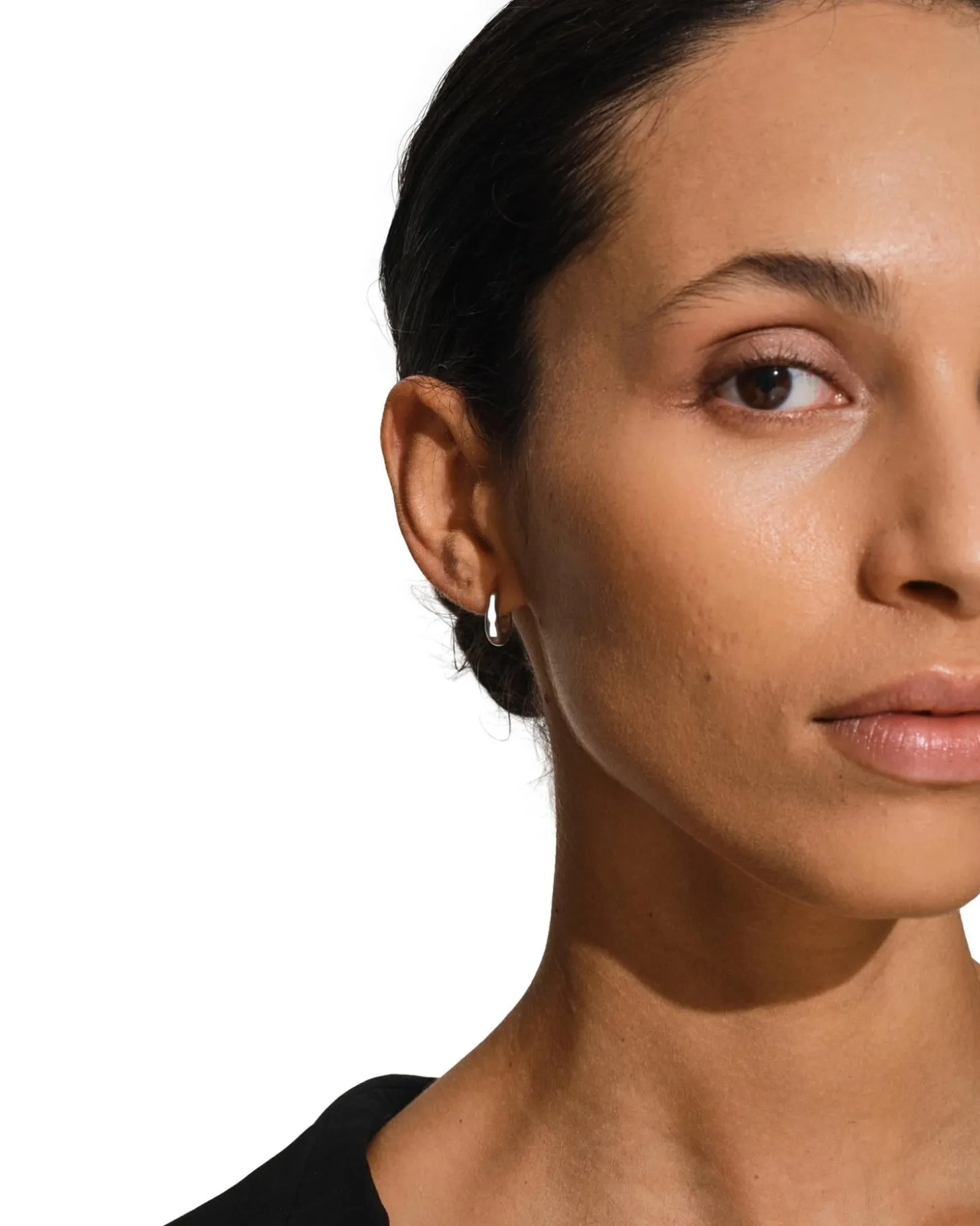 Et delikat par Huggies-øreringer, laget av 925 sterlingsølv med sateng-rodiumbelegg. Alle edle metaller er 100 % resirkulert.