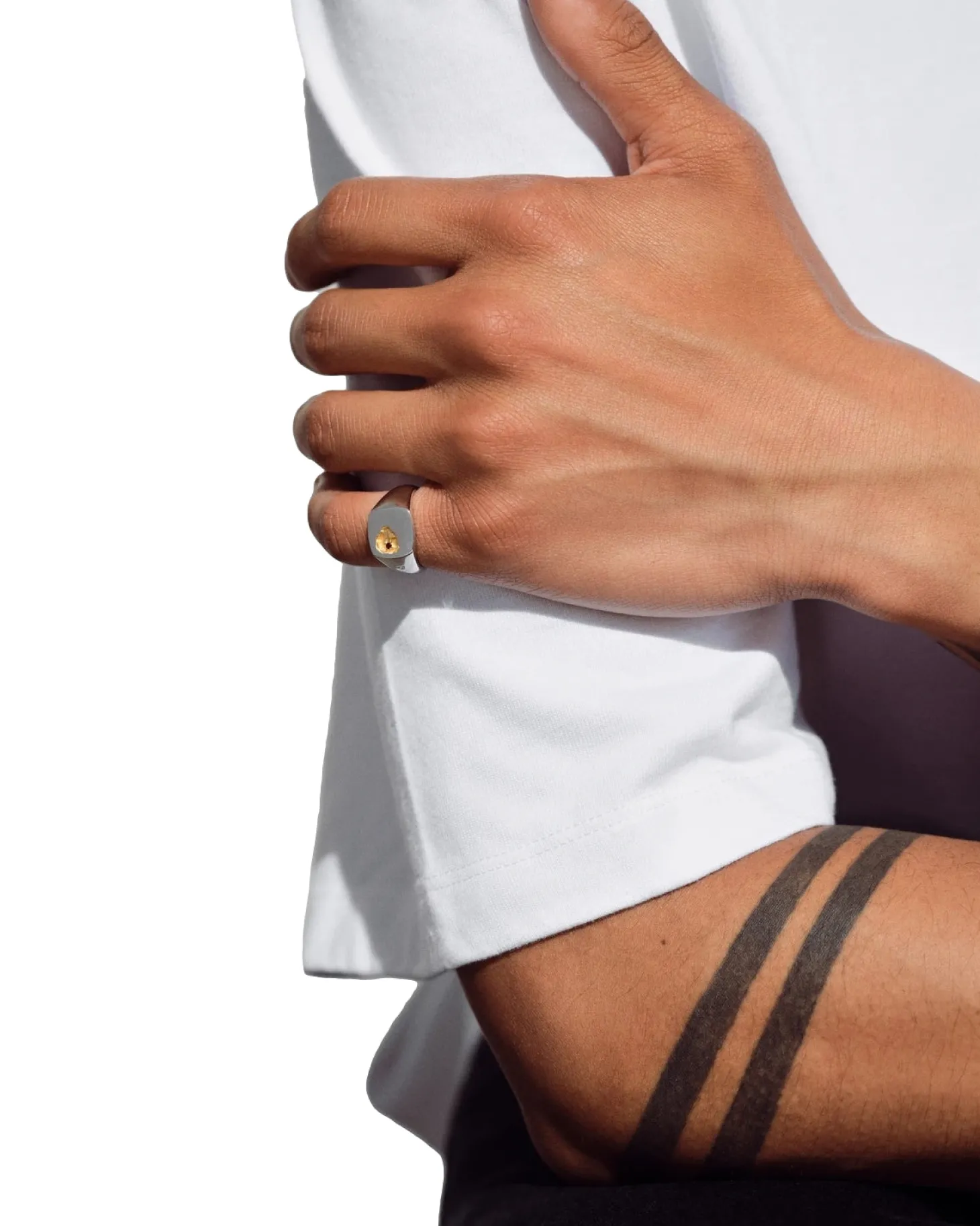 Ringen er laget med solid 925 sterling sølv i en polert finish, belagt med 18K gull og hvitt rhodium for å styrke overflaten og forhindre anløpning.